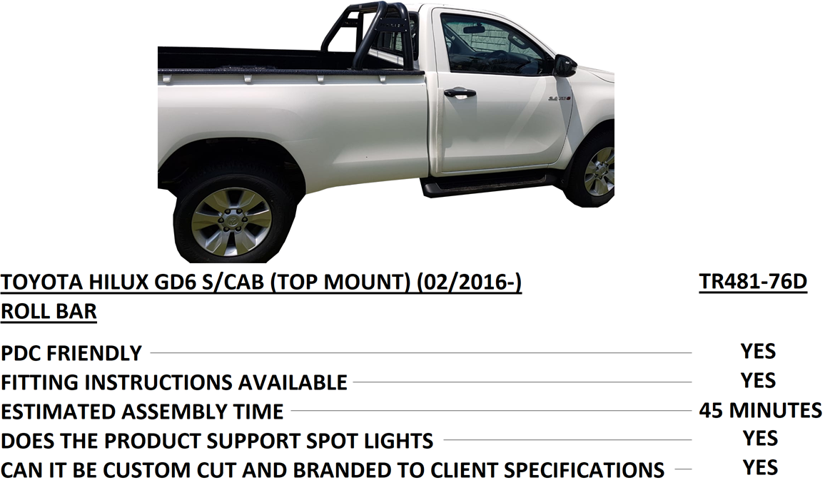 Product Code: TR481-76DThis premium roll bar boosts both style and utility, offering enhanced rollover protection and structural support with a rugged off-road look. Made from durable steel with a corrosion-resistant finish, it's perfect for tough conditions and mounting accessories, all with easy installation and a custom fit.